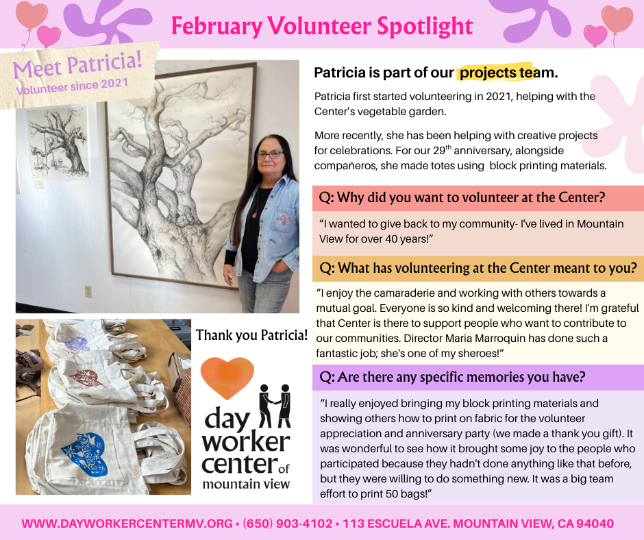 "As an ESL instructor at the Day Worker Center for more than 10 years, I have found that volunteering to teach English has given me a greater appreciation for the resilience of the workers and their families. I have been impressed by the sense of community at the Day Worker Center. The way in which the center operates serves to empower the workers. The Day Worker Center is both a vital resource for the workers and through the labor of the workers provides a great service to the residents of Mountain View and surrounding communities” - Bruce