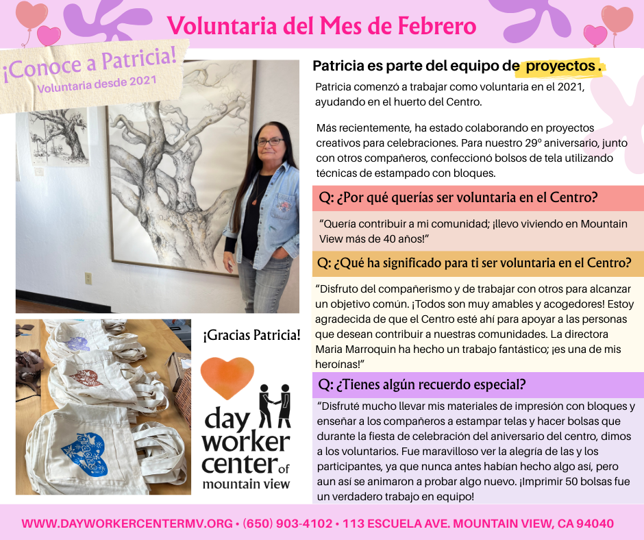 “He sido voluntaria en el Day Worker Center desde hace dos años. Antes de la pandemia, siempre disfrutaba el tiempo que pasaba en el Centro, ayudando con las clases de Inglés y ofreciendo una clase semanal en donde les compañeres podían crear tarjetas. Un ambiente positivo y acogedor llenaba el Centro. Cuando el cierre a causa de Covid se apoderó de la nación, la gente del Centro demostró su verdadero espíritu emprendedor al enfrentar cualquier desafío. En lugar de cerrar toda la operación, les trabajadores comenzaron a coser miles de máscaras, hacer desinfectantes para manos y además, les trabajadores comenzaron a tomar varias clases en línea. Espero seguir apoyando al Day Worker Center en varios proyectos. En este momento estoy trabajando en un proyecto de investigación de recursos desde casa”. - Marilyn